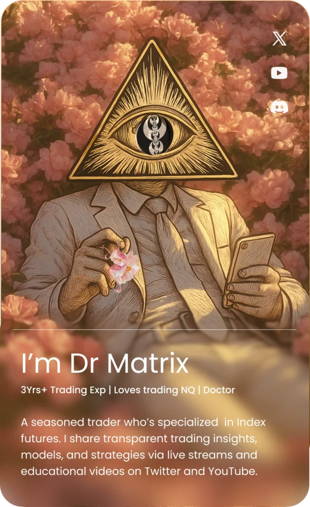 I, Dr. Matrix, am not a licensed financial advisor, investment advisor, broker, or certified financial planner. The information shared reflects my personal opinions and trading experiences, primarily focused on NQ Futures, with community discussions in ICM covering forex, cryptocurrencies, and commodities. It is not tailored to any individual’s financial situation, risk tolerance, or investment goals. You are solely responsible for conducting your own research and consulting a qualified financial professional before making trading or investment decisions. View Full Risk Disclosure